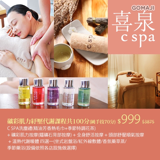 知名登琪爾集團旗下品牌!【喜泉C SPA】礦彩肌力紓壓代謝課程,專業護理為您紓解緊繃沉重的身驅,徹底放鬆輕盈,由內而外透出美麗神采!